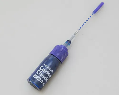 う蝕検知液とは、虫歯になっている部分のみを染め出すことができる薬剤です。